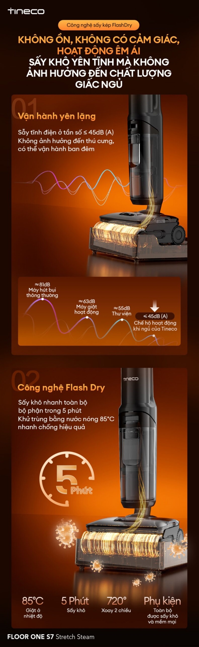 Máy hút bụi lau nhà Tineco Floor One S7 Stretch Steam được trang bị hệ thống tự làm sạch FlashDry tiên tiến, giúp toàn bộ ống dẫn và chổi lăn được vệ sinh chỉ sau một lần chạm. Quy trình bắt đầu bằng việc xả rửa bằng nước nóng 85℃, giúp loại bỏ hoàn toàn cặn bẩn, dầu mỡ và vi khuẩn tích tụ. Sau đó, bạn có thể lựa chọn giữa 2 chế độ sấy khô khác nhau: