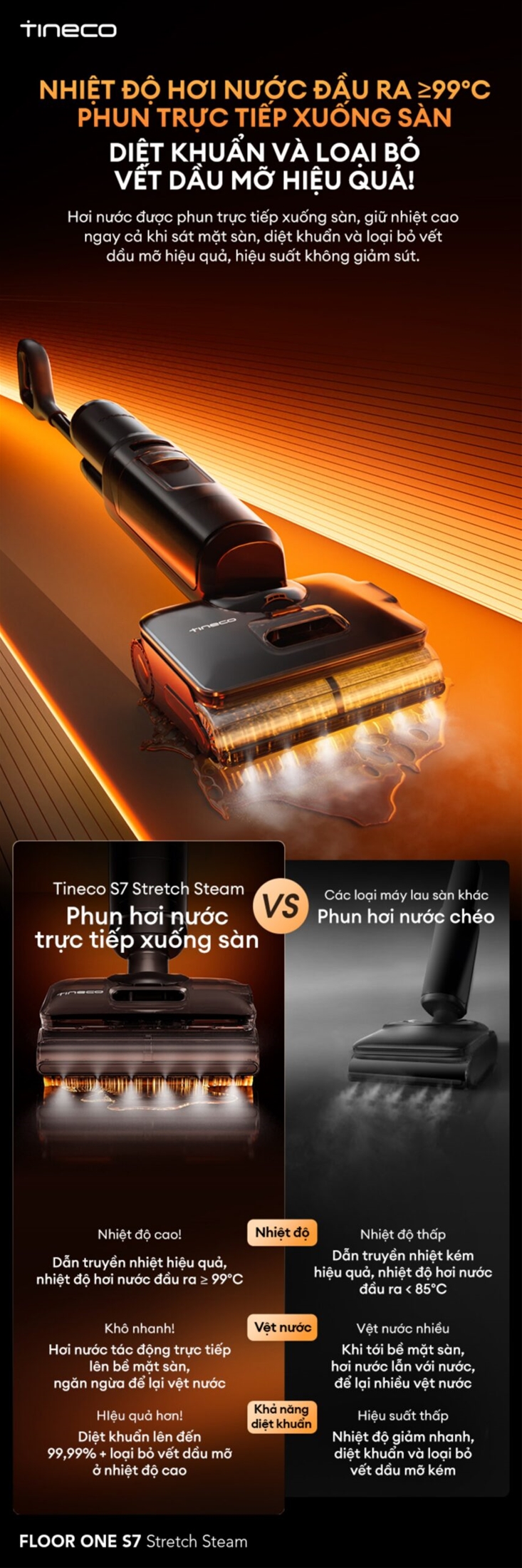 Máy hút bụi lau nhà Tineco Floor One S7 Stretch Steam được trang bị công nghệ HyperSteam 140℃, sử dụng hệ thống đun sôi kép để tạo ra luồng hơi nước duy trì ổn định ở mức 284°F (khoảng 140℃). Nhiệt độ hơi nước đầu ra luôn ở mức trên 99℃, nhờ đó mà Tineco Floor One S7 Stretch Steam có thể dễ dàng hòa tan dầu mỡ, vết bẩn dính hay các mảng bám lâu ngày trên sàn.