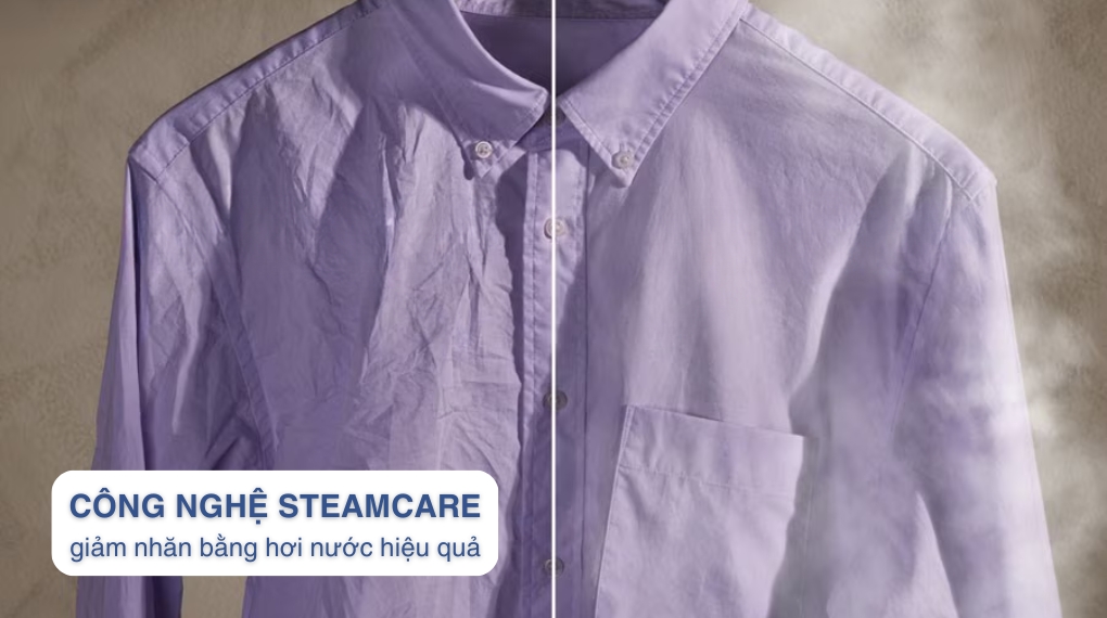 - Công nghệ SteamCare sử dụng hơi nước phun vào lồng trong toàn bộ quá trình sấy. Nhờ việc sử dụng hơi nước, quần áo phẳng hơn, sợi vải mềm mại và mịn màng hơn, giảm thiểu nếp nhăn, dễ dàng cho việc ủi phẳng khi cần thiết. Đồng thời, loại bỏ hiệu quả các mùi hôi khó chịu bám vào quần áo, mang lại cho bạn những bộ trang phục không chỉ sạch sẽ mà còn thơm mát hơn sau mỗi lần sấy.