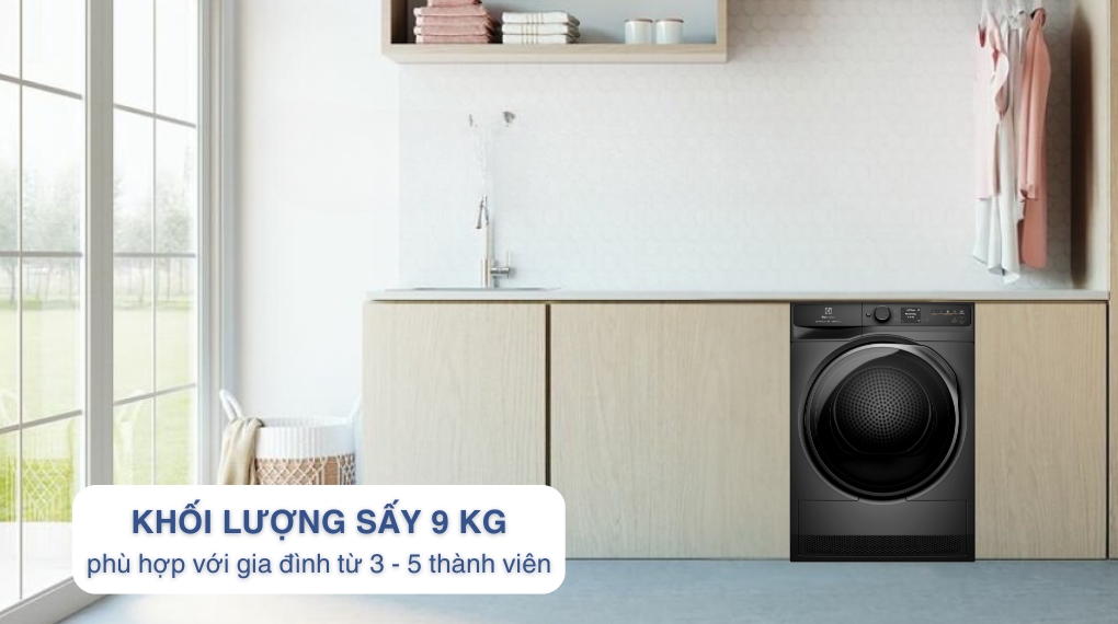 - Máy có khối lượng sấy tối đa là 9 kg thích hợp cho các gia đình từ 3 - 5 thành viên, hoặc gia đình có ít thành viên nhưng nhu cầu giặt giũ, làm khô quần áo cao.