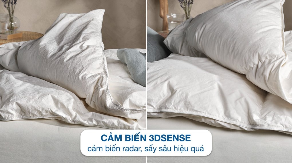 - Công nghệ 3DSense sử dụng cảm biến thông minh để đo độ ẩm hiện có trong quần áo. Máy tự động điều chỉnh thời gian và nhiệt độ sấy phù hợp, đảm bảo quần áo được sấy khô tối ưu mà không gặp phải tình trạng sấy quá lâu gây hao tốn điện năng, hoặc nhiệt độ quá cao làm co rút vải. Công nghệ cảm biến 3DSense giúp bảo vệ sợi vải, đồng thời mang lại hiệu quả tiết kiệm năng lượng trong quá trình vận hành.