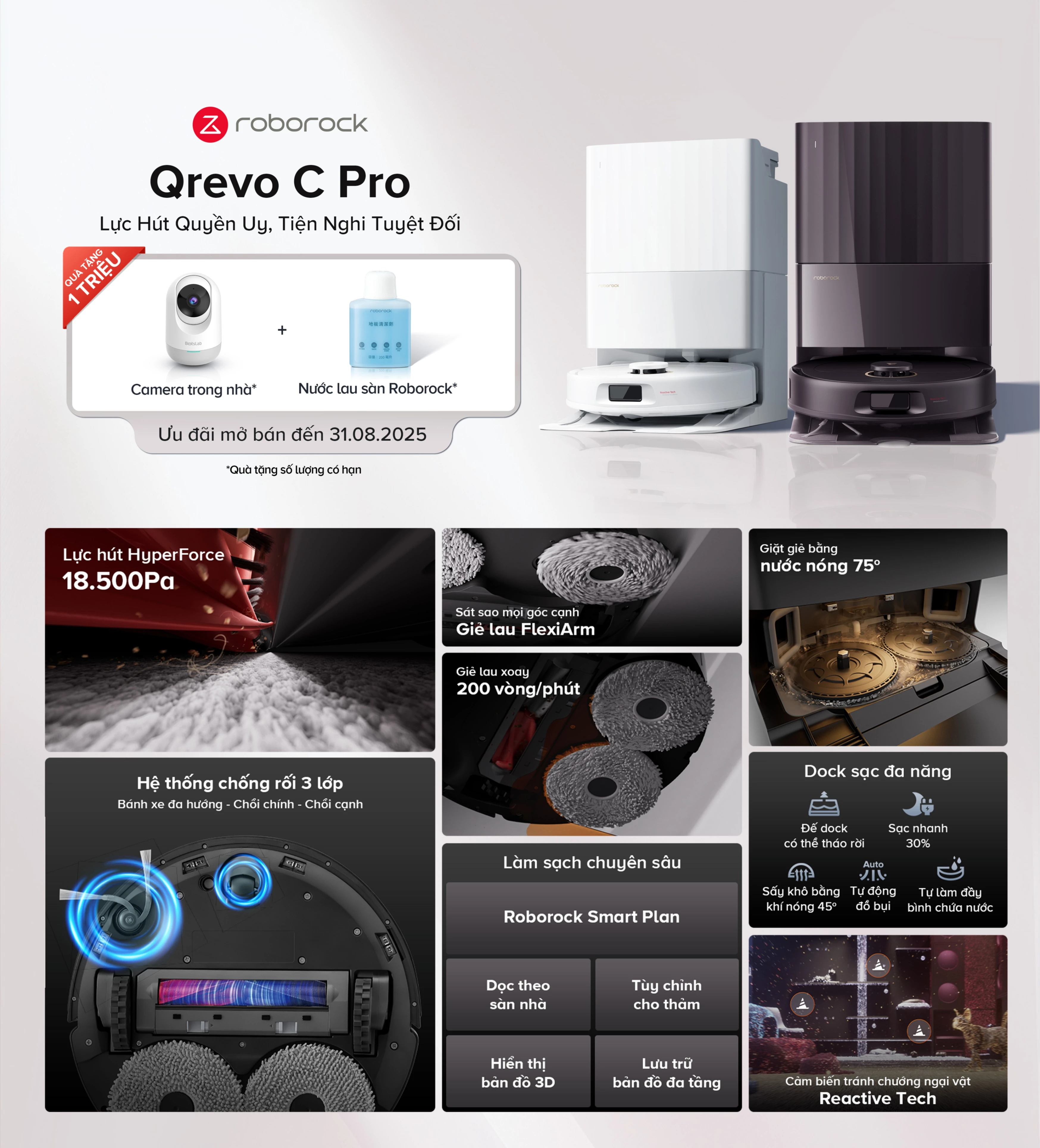 Robot hút bụi lau nhà Roborock Qrevo C Pro là giải pháp dọn dẹp thông minh được thiết kế để đồng hành cùng cuộc sống hiện đại. Sở hữu lực hút mạnh mẽ lên đến 18.500Pa, hệ thống chống rối ba lớp, cây lau có thể kéo dài, cùng trạm sạc đa năng tích hợp giặt giẻ, sấy khô, đổ rác hoàn toàn tự động, robot mang đến trải nghiệm vệ sinh tiện lợi và hiệu quả vượt trội. Công nghệ tránh vật cản Reactive Tech, định vị PreciSense LiDAR, và ứng dụng Roborock thông minh giúp bạn điều khiển và theo dõi dễ dàng, mọi lúc mọi nơi.