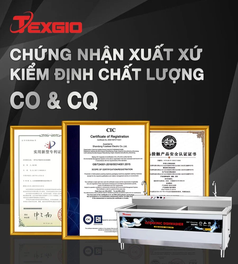 Sản phẩm Máy Rửa Chén Bát Công Nghiệp Texgio có đầy đủ Chứng nhận xuất xứ và Kiểm định chất lượng.