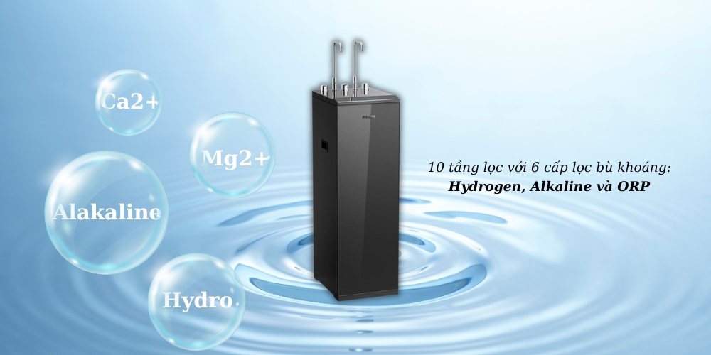 Nhờ hệ thống 10 tầng lọc với 6 cấp lọc bù khoáng, máy không chỉ lọc sạch nước mà còn biến nước uống thành nguồn tăng cường năng lượng tự nhiên, bổ sung điện giải, khoáng chất có lợi và tạo ra nước kiềm hỗ trợ sức khỏe toàn diện.