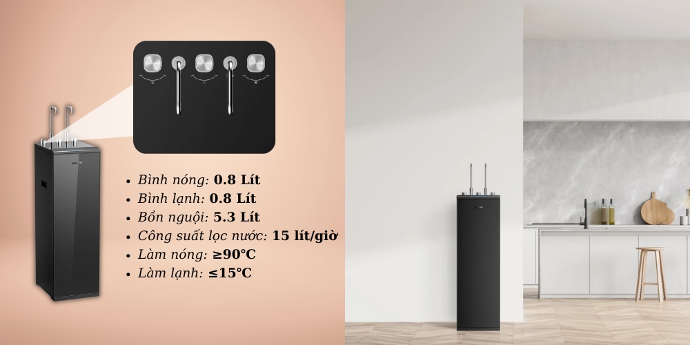 Dung tích bình chứa nóng 0.8 L, lạnh 0.8 L, nguội 5.3 L, đáp ứng hiệu quả nhu cầu sử dụng hằng ngày, mang đến cho gia đình Việt những ly nước mát lạnh hoặc ấm nóng bất cứ lúc nào.