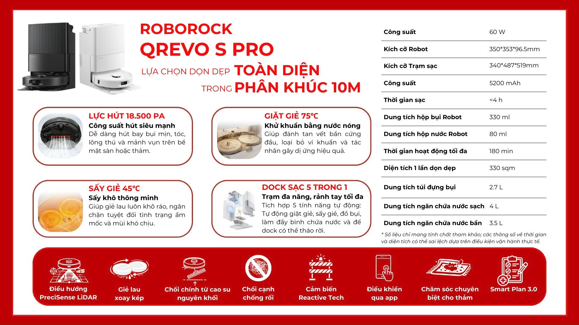 - Lực hút mạnh HyperForce 18.500 Pa: Khả năng làm sạch mạnh mẽ, có thể dễ dàng loại bỏ bụi bẩn tích tụ sâu trong thảm và khe sàn