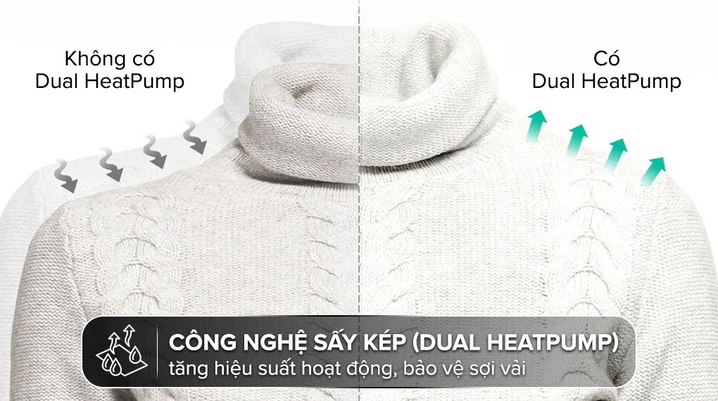 - Hệ thống sấy kép Dual HeatPump vận hành ở nhiệt độ thấp, giúp trang phục khô tự nhiên, mềm mại mà không bị biến dạng hoặc mất màu.