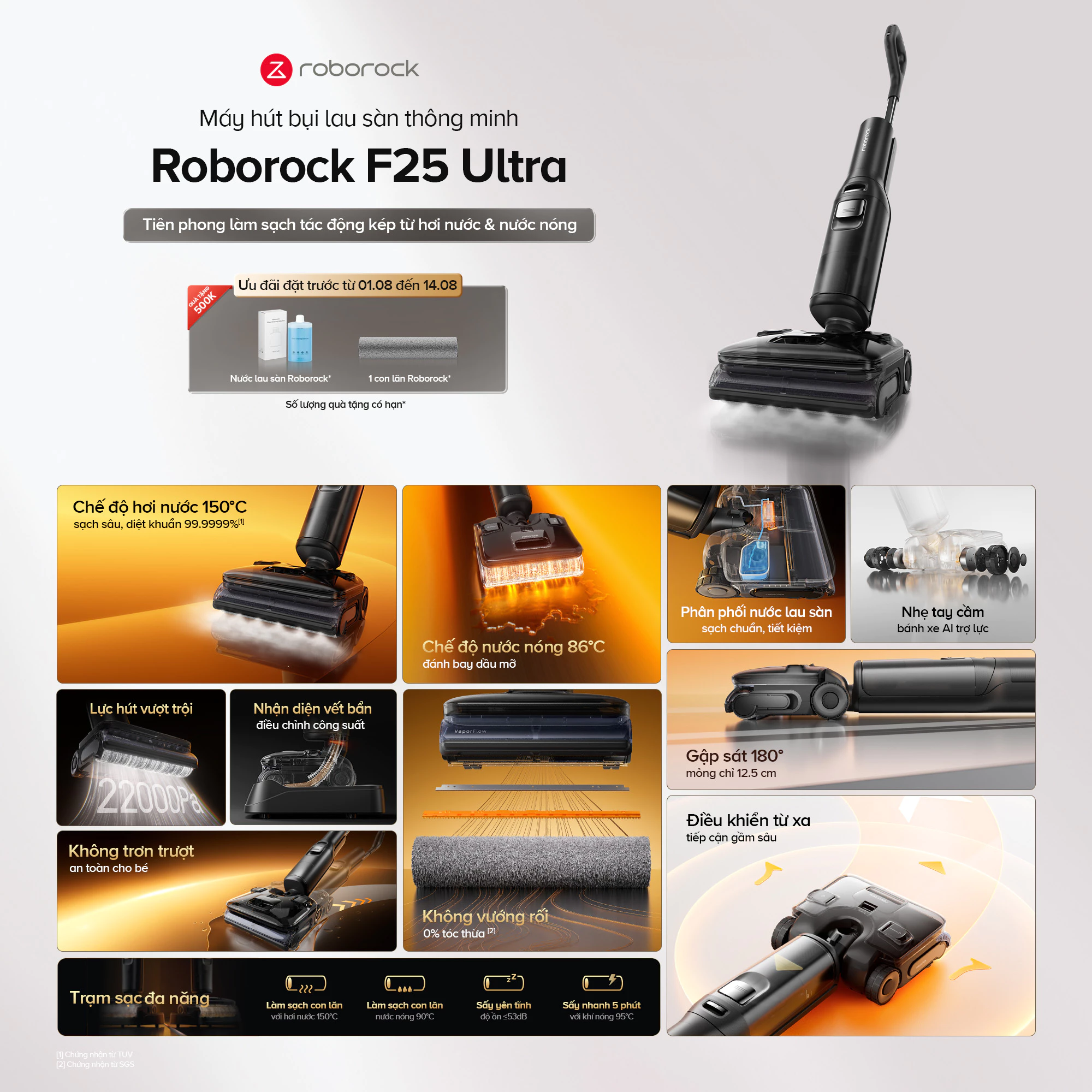 - 𝐅𝟐𝟓 𝐔𝐥𝐭𝐫𝐚 đ𝐢̉𝐧𝐡 𝐜𝐚𝐨 𝐧𝐡𝐚̂́𝐭: Tự giặt giẻ nước nóng 90 độ C, nhưng lau nhà bằng hơi nước nóng 150 độ C, tự lau nhà bằng nước nóng 86 độ C (các bản trên kia ko có lau nhà bằng nc nóng), tự sấy giẻ bằng khí nóng 95 độ C. Pin 60 phút, lực hút 22.000Pa.
